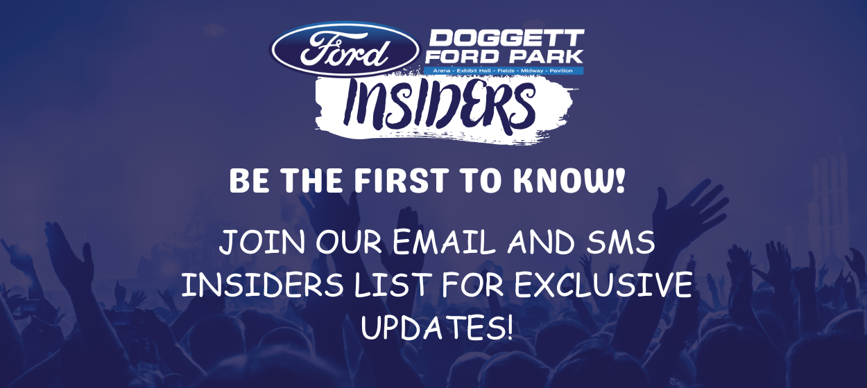 The Doggett Ford Park Insiders Club is the easiest way to keep up with what is going on at Doggett Ford Park. It is simple to join, and won’t cost you a dime. We will send you periodic emails and/or SMS with event announcements pre-sale opportunities, and last minute event alerts.